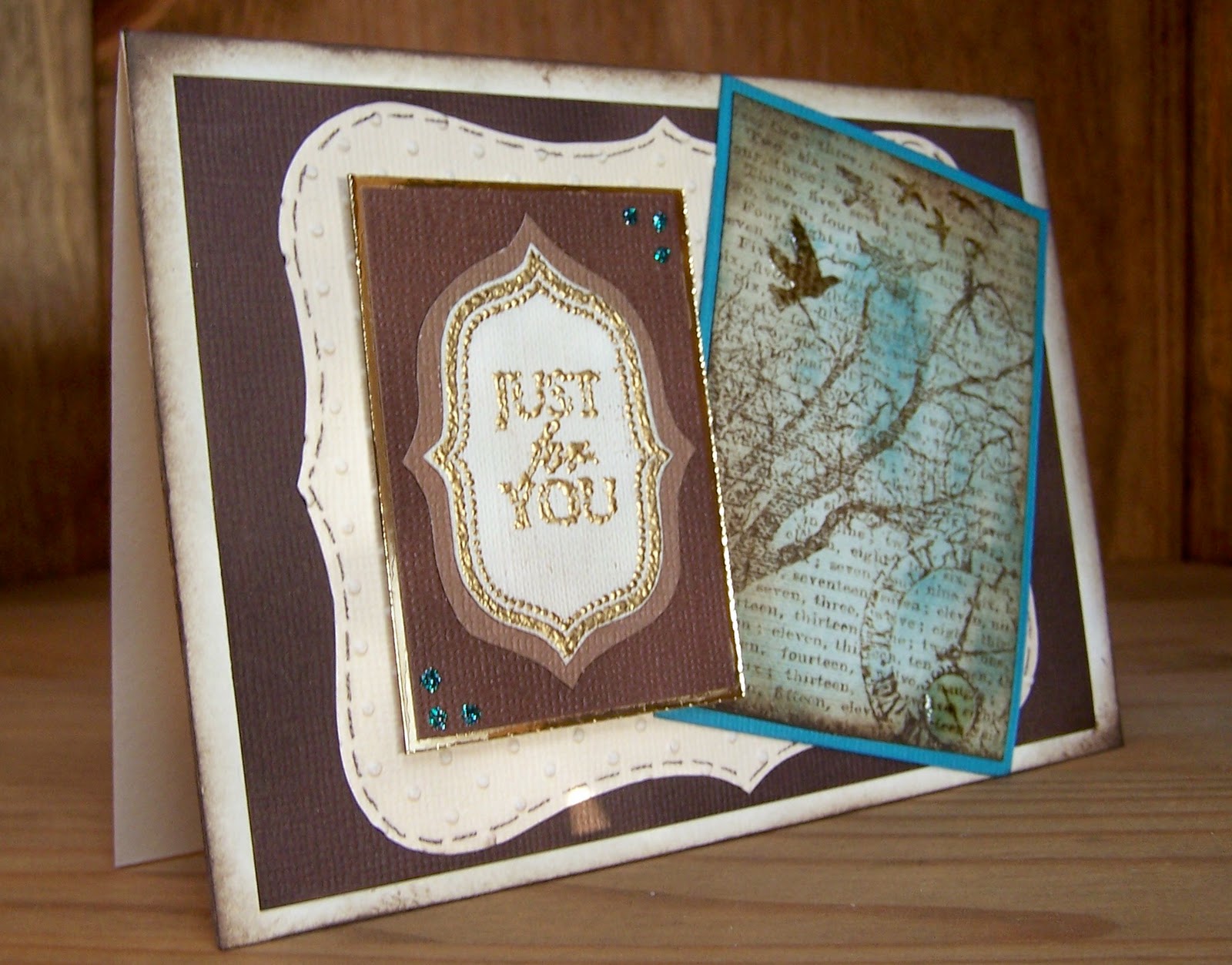 The 'just for you' was stamped using embossing ink then heat embossed with gold.After I put the card together I used walnut stain DI to go around the edges of the card base.