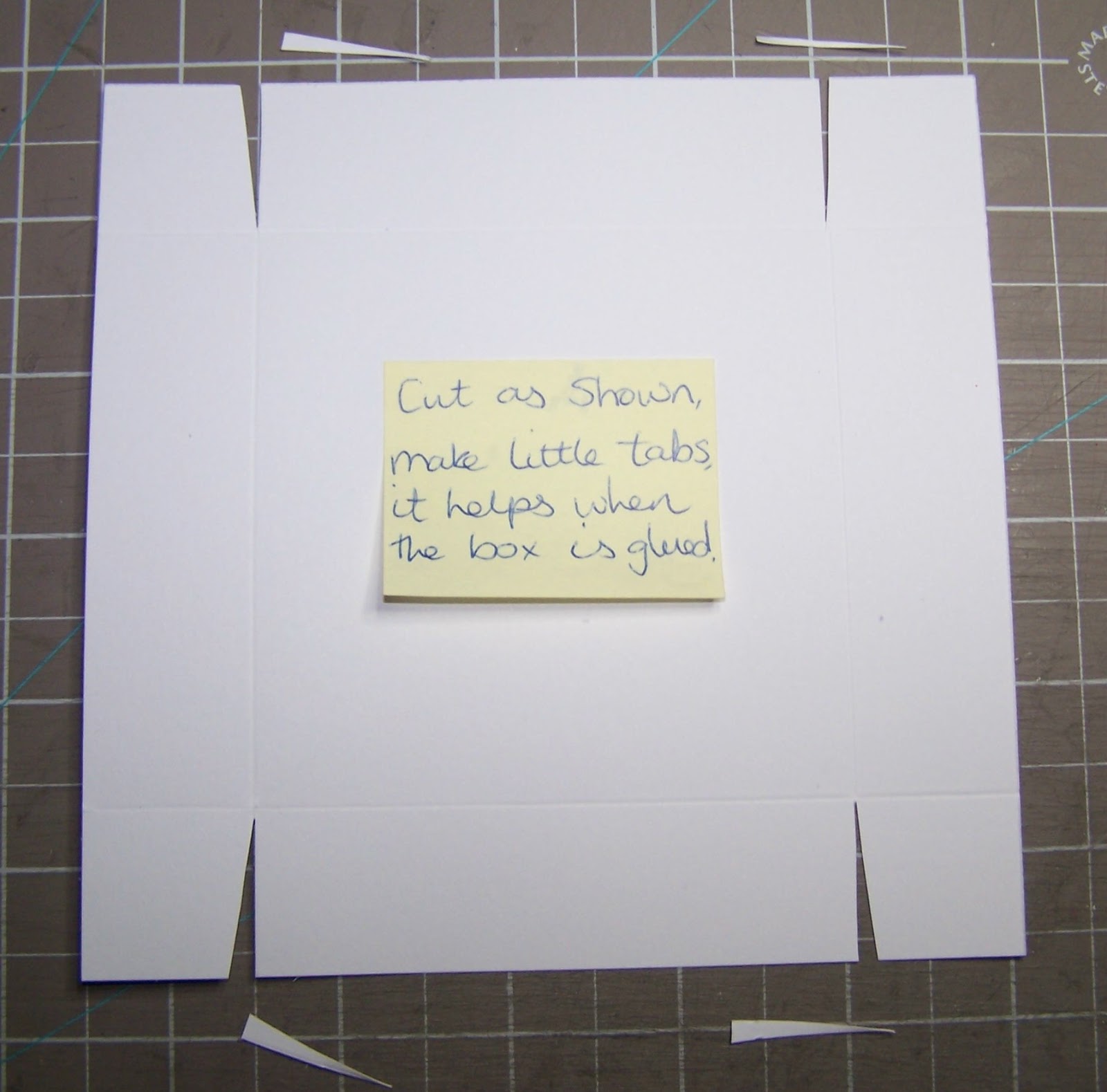 Put glue on the underside of the tabs and fold in and the sides up to make a box.